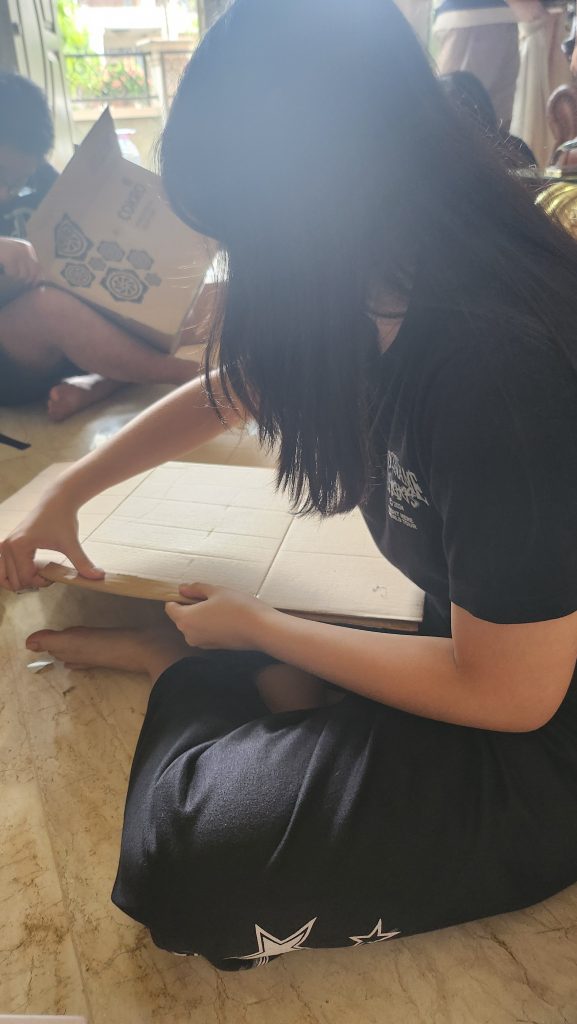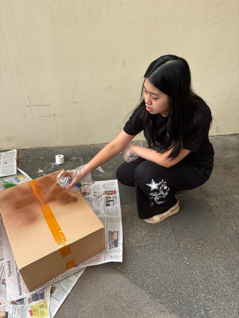 Pada tanggal 10 Januari kami berkumpul kembali di rumah teman untuk melanjutkan pengerjaan dekor. Kegiatan utama hari itu adalah melakukan proses pilox yang akan digunakan agar menyerupai peti kayu milik pedagang. Sebelum proses pilox dilakukan kami terlebih dahulu membentuk ulang kardus bekas supaya strukturnya lebih rapi dan layak untuk dicat. Dari proses ini saya belajar bahwa persiapan bahan yang baik sangat menentukan hasil akhir dekor agar terlihat lebih meyakinkan di atas panggung.