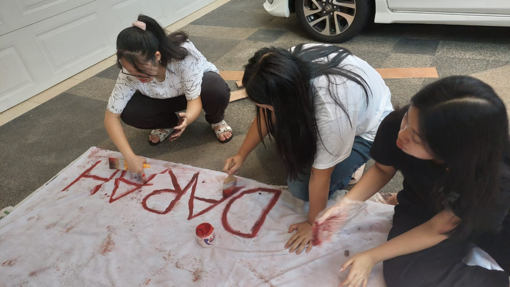 Hari ini saya memotong, melakban, dan mewarnai kardus menggunakan pilox agar kardus terlihat seperti kotak-kotak untuk berjualan. Saya juga menulis plakat dengan tulisan “Darah dibalas Darah” menggunakan cat warna merah untuk dekorasi pada saat perang. Kesulitan yang kami alami adalah kekurangan bahan. Sehingga, kegiatan dilanjutkan pada hari selanjutnya.