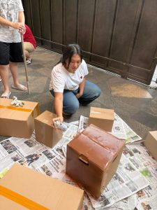 Pada hari ini, saya bersama teman-teman sie dekorasi melakukan pemotongan kardus, mempilox box hingga berwarna cokelat, serta mengecat kain dengan tulisan “darah dibalas darah”. Kegiatan ini dilakukan sebagai bagian dari persiapan dekorasi sesuai konsep yang telah direncanakan. Kendala yang kami hadapi pada hari ini adalah keterbatasan waktu dan bahan, sehingga beberapa proses harus dilanjutkan pada hari berikutnya.