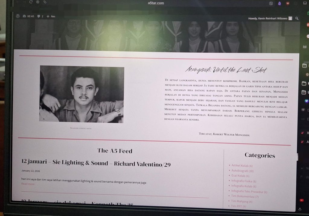 Saat mengikuti latihan UPRAK, saya menjalankan dan melatih bagian saya sebagai aktor pendukung. Setelah bagian-bagian saya sudah selesai, saya berdiskusi dengan tim web dan publikasi mengenai alur trailer dan juga ide poster film. Akhirnya, kami menyetujui konsep-konsep yang akan direalisasikan. Di sela-sela latihan, saya juga menambahkan informasi mengenai drama UPRAK kami ke dalam website kelas a5tar.com yang dimana juga akan dicantumkan trailer pada awal bulan Februari.