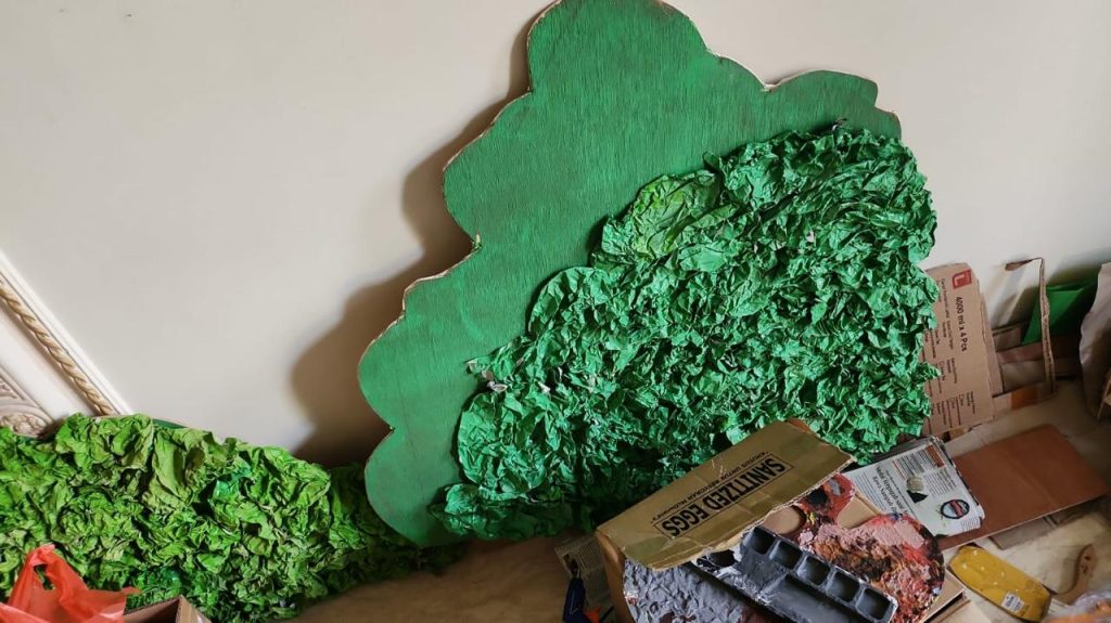 Hari ini kami melanjutkan meremas-remas kertas buram yang sudah dipilox dengan warna yang berbeda untuk membuat semak semak kedua. Sejujurnya, sedikit memakan waktu lebih banyak karena warna kertas yang kami gunakan tidak selalu memiliki tone warna yang sama, bahkan ada yang bagian abu abunya masih terlihat. Meskipun demikian, kami dapat menyelesaikan semak semak kedua, yang artinya kami hanya tinggal menyelesaikan semak semak pertama dan ketiga yang belum selesai serta triplek penyangganya agar semak semak ini dapat berdiri.