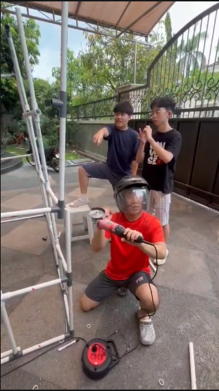 Pada saat itu, anggota perkap lainnya belum datang ke rumah Kevin, sementara deadline pembuatan penjara sudah sangat terlambat. Oleh karena itu, saya mengambil inisiatif untuk membantu. Gambar tersebut menunjukkan saya sedang membantu mengukur dan memotong properti penjara yang dibuat oleh tim perkap. Situasi tersebut juga sempat diperumit oleh adanya miskomunikasi antara sutradara dan anggota-anggota perkap kami.