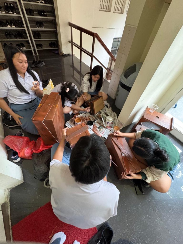 Pada tanggal 13 Januari, kami melaksanakan latihan di sekolah yang bertempat di Francis Room. Pada kesempatan tersebut kami membantu mengangkat dan membawa barang ke lantai tiga sebagai persiapan latihan drama. Selain itu, saya bersama teman-teman juga melanjutkan tugas sebelumnya dengan mengecat box-box hingga tampil menyerupai tekstur kayu.