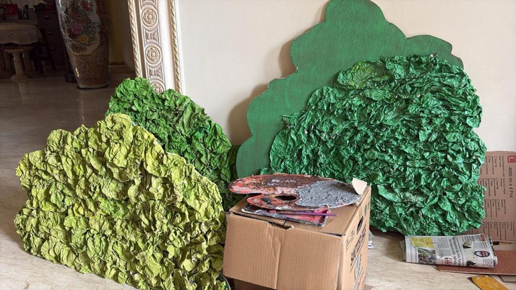 Hari ini kami melanjutkan membuat semak-semak yang ketiga, yakni dengan warna yang berbeda dengan yang pertama dan kedua. Kami meremas-remas kertas buram dan menempelkannya pada triplek menggunakan lem kayu. Kami juga membuat triplek penyangga agar semak-semak ini dapat berdiri. Namun, kami tidak dapat menyelesaikan semak semak yang pertama karena terkendala di pilox yang digunakan untuk mempilox kertas buramnya. Pada hari itu, hanya beberapa anak sie dekorasi yang datang dan mungkin total anak yang datang hari itu hanya sekitar 4-5 orang sehingga tidak ada yang dapat membelikan pilox dengan warna tersebut.