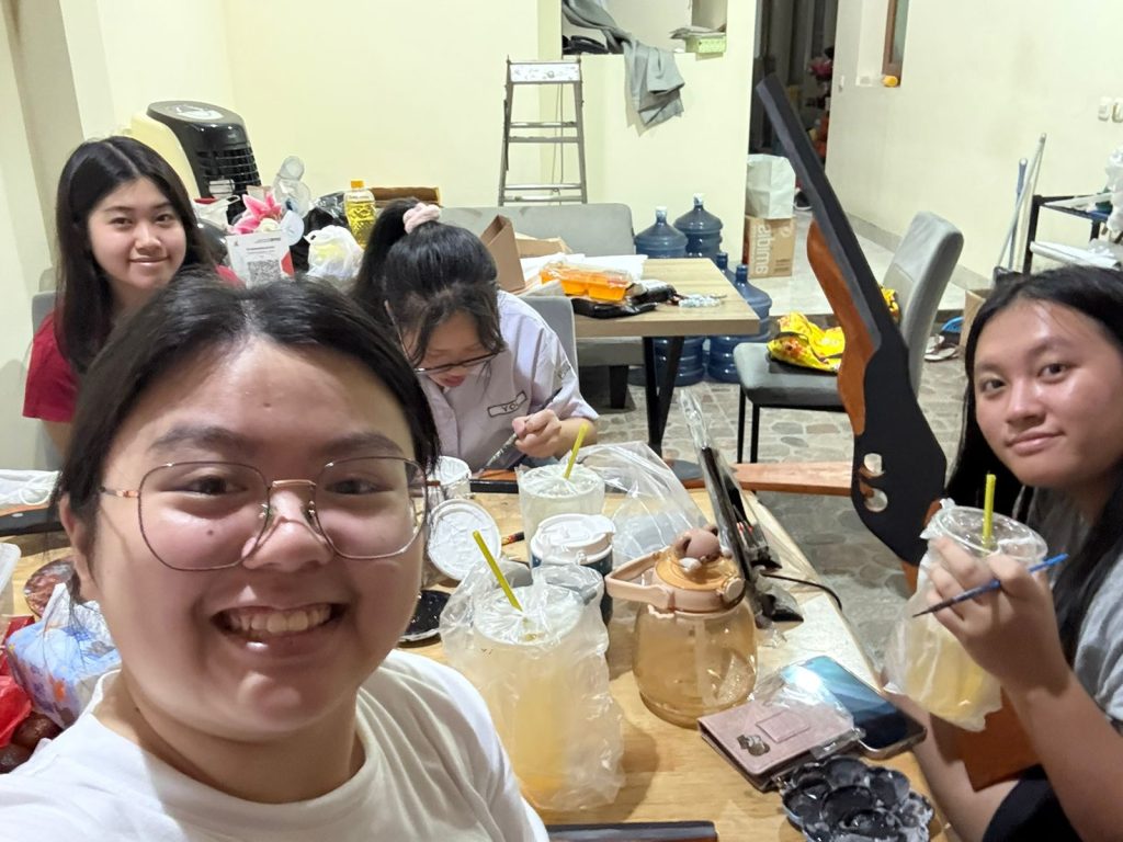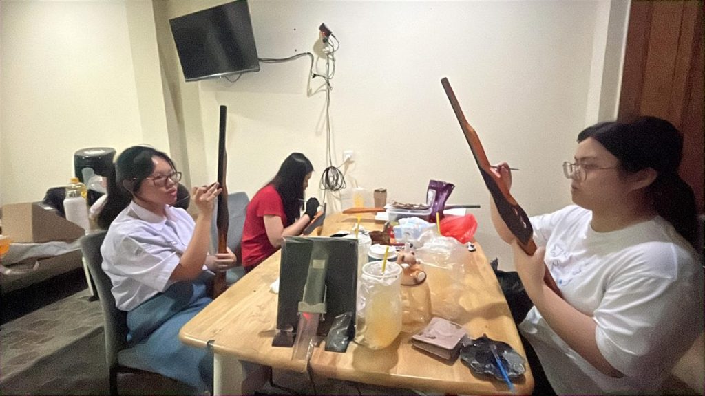 Pada tanggal 19 Januari, hari Senin setelah pulang sekolah, kami melanjutkan tugas dari hari sebelumnya dengan kembali mengecat properti senjata yang telah disiapkan. Dari total sepuluh senjata, kami menyelesaikan pengecatan sambil memastikan warna dan detailnya sesuai agar siap digunakan saat pertunjukan nanti.