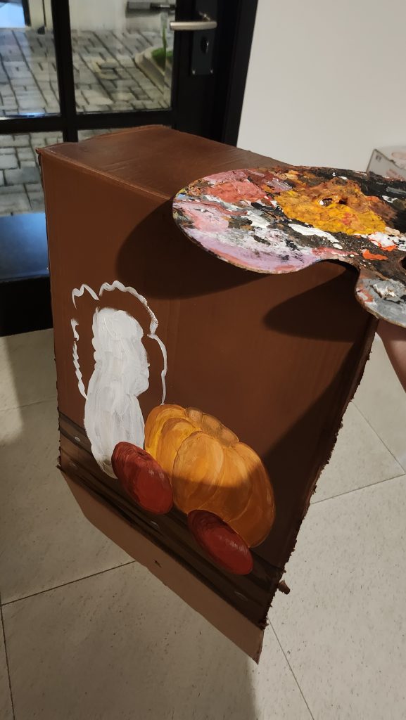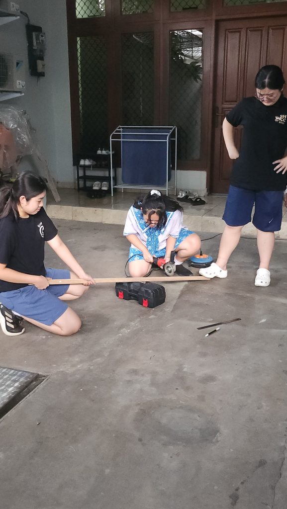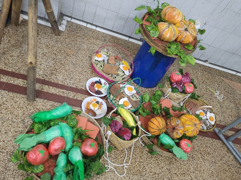Pada tanggal 5 Februari, setelah pulang sekolah, kami satu kelas tetap melanjutkan latihan drama meskipun sudah mendekati waktu-waktu padat. Di sela latihan tersebut, saya kembali mengerjakan properti untuk scene pasar dan pesta rakyat, khususnya membuat sayur, buah, serta makanan yang akan ditampilkan agar suasana terlihat lebih hidup. Kami menempelkan properti itu bersama-sama dan mengatur display dengan lebih rapi, serta menggunakan penguat agar tidak mudah jatuh saat digunakan di panggung. Setelah pekerjaan di sekolah selesai, saya dan teman-teman dekor melanjutkannya lagi di kos dengan menyesuaikan tongkat pramuka yang dipotong dan digerinda agar pas digunakan sebagai pikulan pedagang, memperbaiki box yang rusak, serta saya melukis papan jualan sayur. Hari itu terasa panjang dan melelahkan, tetapi dari proses ini sangat menentukan kekuatan suasana di panggung dan membutuhkan ketekunan untuk menyempurnakannya.