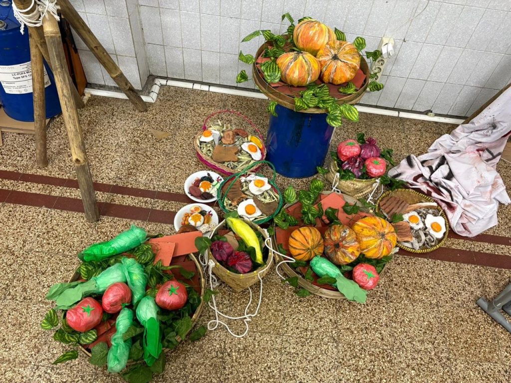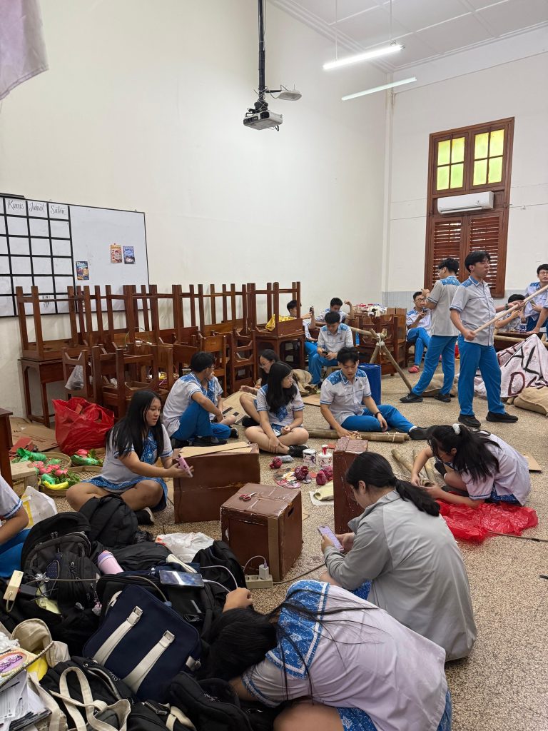 Hari ini saya meminjam ruangan di A201 sepulang sekolah untuk persiapan. Khusus hari ini, kami banyak berfokus untuk menyelesaikan dekorasi yang tidak kunjung selesai. Kami juga memperbaiki beberapa properti yang rusak. Papan-papan berbentuk kayu dari properti box kami ada yang lepas karena belum dilem dengan baik. Saya membantu mengelemnya dan membuatkan beberapa papan-papan yang baru dengan memotong kardus sesuai ukuran sebelumnya untuk box yang benar-benar rusak. Tali yang menyatukan properti barikade bambu kami juga banyak yang kendor karena memasangnya kurang baik padahal baru dipasang kemarin. Karena itu, saya meminta tolong mereka untuk memperbaikinya menggunakan teknik mengikat Pramuka yang benar.