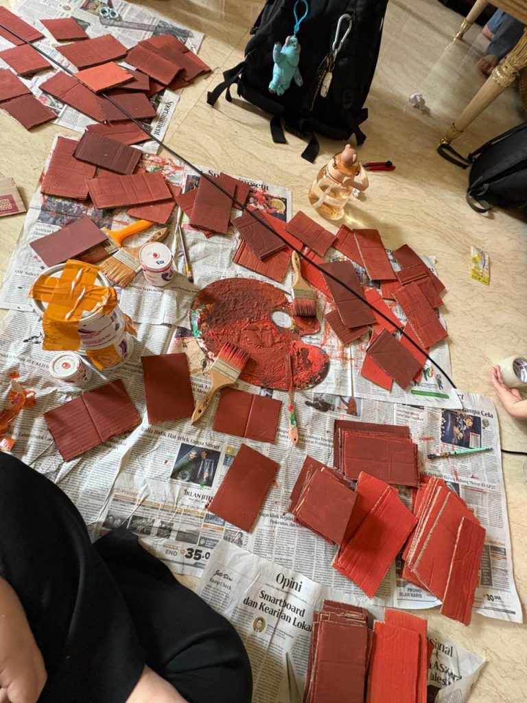 Pada tanggal 8 Desember kami mulai mengerjakan latar yang akan ditempelkan pada pipa bagian belakang dekor. Latar tersebut dibuat dari kardus yang nantinya akan ditempeli batu bata kecil sebagai detail visual. Pada hari itu kami fokus pada proses mengecat batu bata satu per satu menggunakan cat merah agar tampil seragam dan menyerupai bata sungguhan. Kegiatan ini membutuhkan ketelatenan dan kesabaran karena dilakukan secara manual, sekaligus melatih konsistensi agar hasil akhir terlihat rapi saat dipasang di panggung.