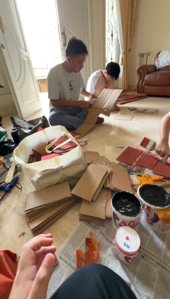 Hari ini kami melanjutkan memotong kardus menjadi bentuk persegi panjang seperti bata. Beberapa dari kami memotong kardus dan beberapa mengecatnya supaya dalam satu waktu dua pekerjaan dapat berjalan bersamaan dan cepat selesai. Hari ini saya mendapat bagian mengecat kardus kardus yang sudah dipotong. Namun, saya mengalami sedikit kendala dalam mencampurkan cat untuk mendapatkan tone warna yang saya inginkan sehinga sedikit memakan waktu. Namun, pada akhirnya perbedaan tone warna yang ada membuat dinding batu bata yang kami buat terlihat sangat nyata.