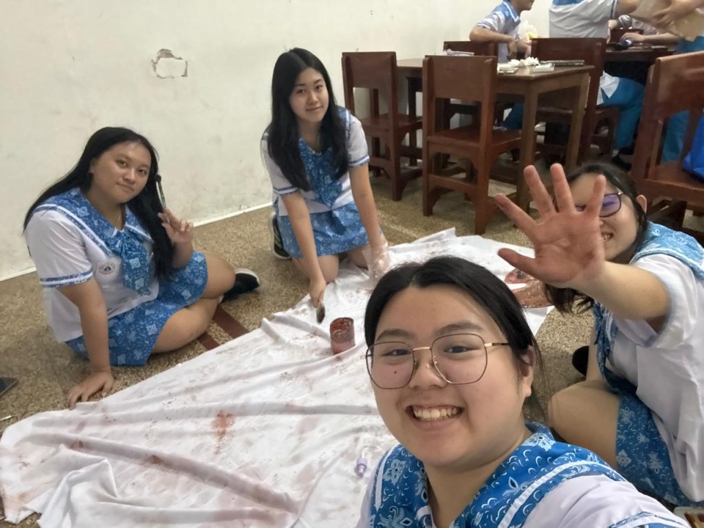 Hari ini kami melanjutkan pekerjaan kami setelah libur akhir tahun. Hari ini kami melanjutkan membuat plakat untuk scene penyergapan tentara Belanda. Karena masih bingung tentang tulisan yang akan ditorehkan di kain, kami memutuskan untuk mengotori kainnya terlebih dahulu supaya terlihat seperti sedang dalam masa peperangan. Kami mencipratkan air yang sudah kami beri warna sebelumnya dan menggunakan tangan secara langsung untuk mengotori kain tersebut.